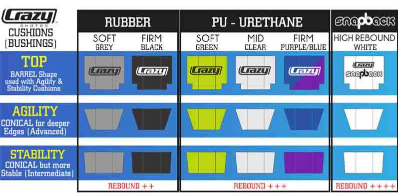 Crazy Skates PU Cushions are high-density, high-rebound cushions designed for Crazy Venus & Apollo Plates. The top cushions fit neatly through the trucks, actually putting it in contact with the bottom cushions, which come in two conical varieties - agility & stability. The stability cushions promote a consistent, steady ride while the more sharply-angled agility cushions are highly responsive!